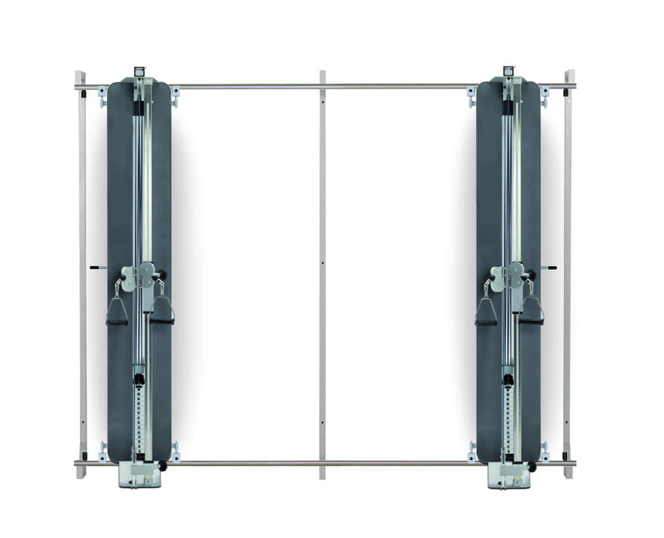 Praktische Vorrichtung, mit der die Zugapparate bequem verschoben werden können, um sie nach Bedarf zu platzieren oder zusätzlichen Platz zu schaffen. Zur besseren Veranschaulichung beinhaltet die Abbildung 2 Zugapparate, die im Lieferumfang nicht enthalten sind.